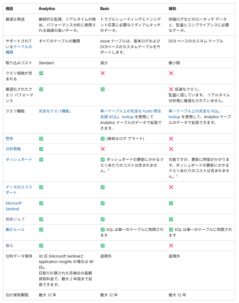 ※ Azure Monitor ログの概要 - テーブルプラン より抜粋