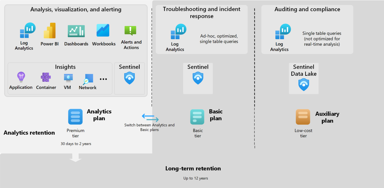 Analytics Logs は 最大 730 日、Basic Logs は 8 日間しかログを保持できませんが、