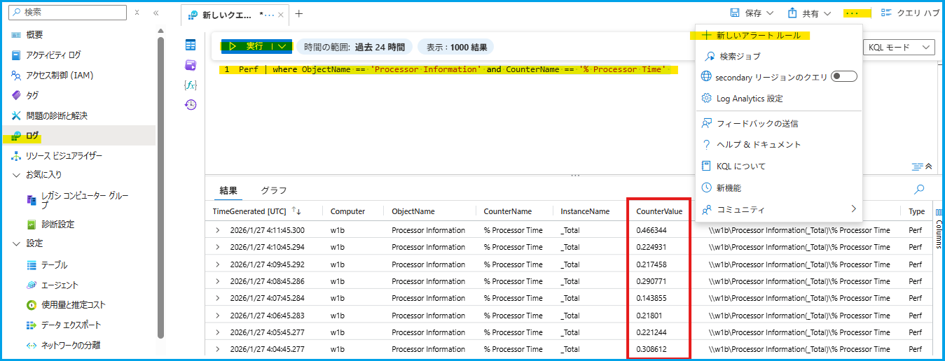 [ログ] から Perf | where ObjectName == 'Processor Information' and CounterName == '% Processor Time' を入力します。