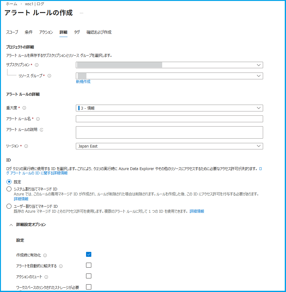 [詳細設定オプション] は既定の状態 (作成時に有効化のみチェックが入っている状態) とします。また、今回は Log Analytics ワークスペースのログを対象にクエリを実行するため、Identity でマネージド ID を有効化する必要はございません。
