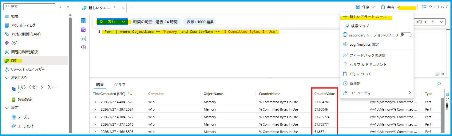 [ログ] から Perf | where ObjectName == 'Memory' and CounterName == '% Committed Bytes In Use'を入力します。