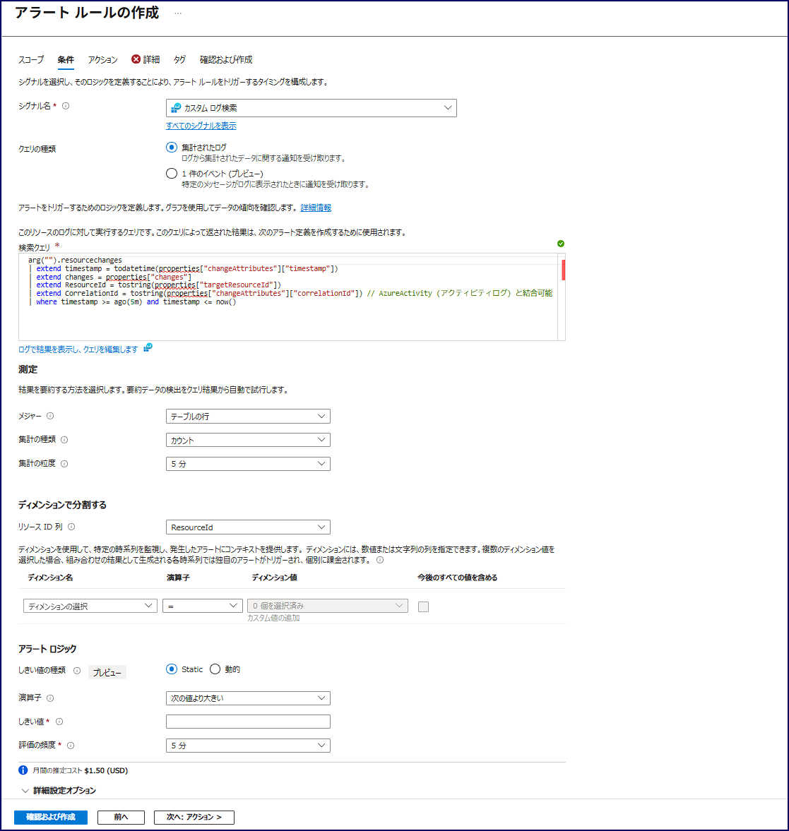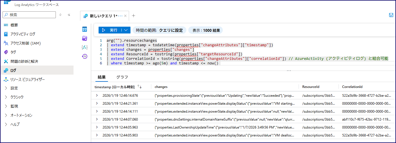 | arg("").resourcechanges | extend timestamp = todatetime(properties["changeAttributes"]["timestamp"]) | extend changes = properties["changes"] | extend ResourceId = tostring(properties["targetResourceId"]) | extend CorrelationId = tostring(properties["changeAttributes"]["correlationId"]) // AzureActivity (アクティビティログ) と結合可能 | where timestamp >= ago(5min) // arg("") で検索するテーブルにはアラートルールの粒度や期間指定が機能しないため、クエリで期間を指定します。